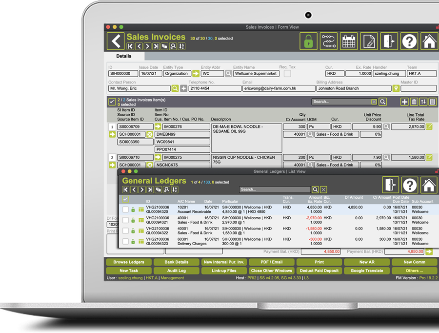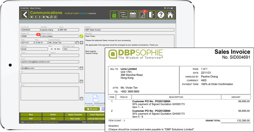 Not just an ordinary email client, you can instantly send out document generated by the system such as quotation, sales invoice to customer or purchase order to supplier. For the received emails, system can also auto link them up with the related database record
